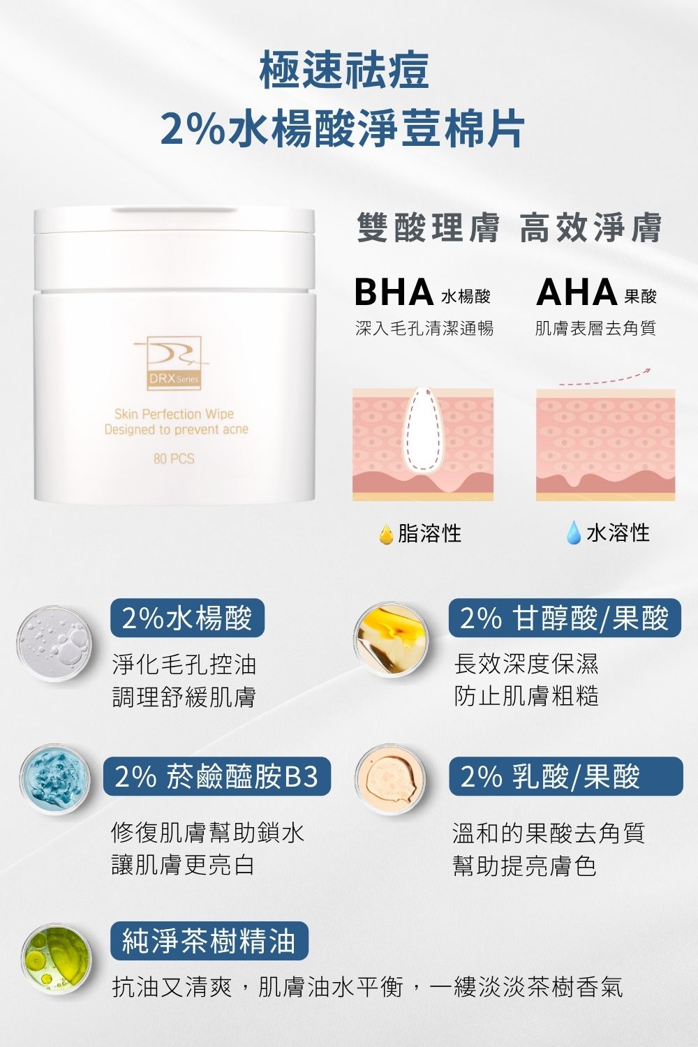2%水楊酸棉片擁有三種酸類,水楊酸、甘醇酸與杏仁酸,還融合了明星成分—茶樹精油與菸鹼醯胺。幫助肌膚控油、預防面皰。面對多變的肌膚狀況,這款三酸水楊酸棉片讓你輕鬆應對!