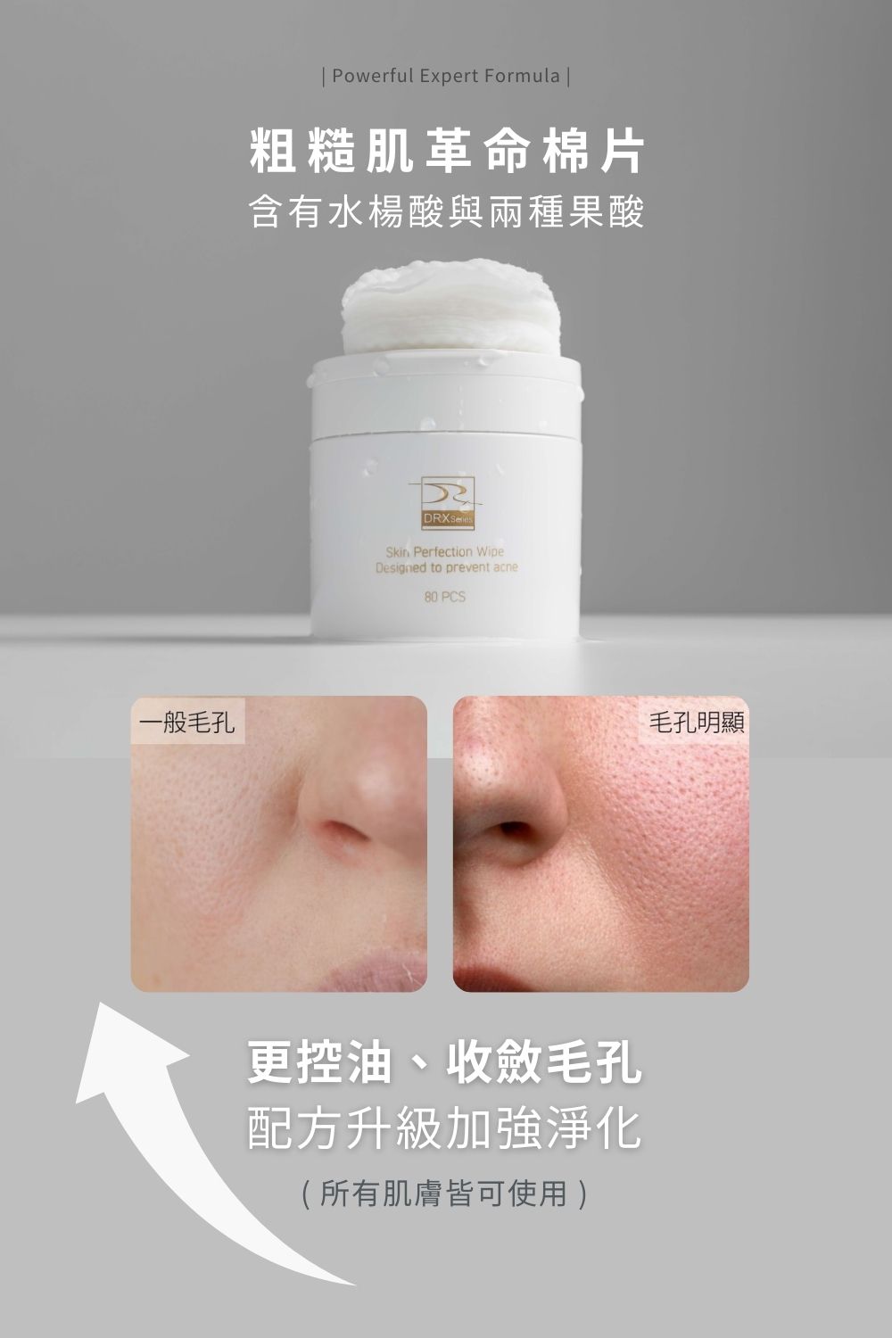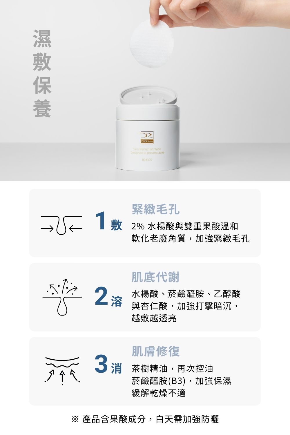 DRX水楊酸棉片不僅含有保養品中最高濃度的2%水楊酸,更額外添加2%甘醇酸與2%杏仁酸。