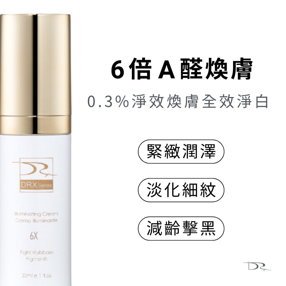 DRX 6倍全效淨白A醛煥膚,質地好吸收,擦起來更輕盈。在高溫黏膩的夏天使用或防曬乳之前使用也不會造成肌膚負擔。維他命B5能舒緩肌膚不適,保濕鎖水。配方中還擁有海藻糖、大豆油植物萃取精華,以及玻尿酸等保濕成份,進一步提升肌膚的水潤感與飽滿,使肌膚輕易維持透亮光澤。